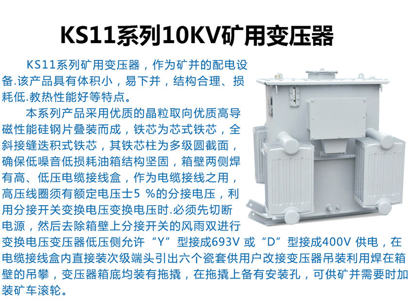 KS11變壓器適用于煤礦井下中央變電所、井底車場(chǎng)、總進(jìn)風(fēng)道和主要進(jìn)風(fēng)道,雖有瓦斯但無(wú)爆炸危險(xiǎn)的場(chǎng)所。也適用于隧道比較潮濕的環(huán)境中